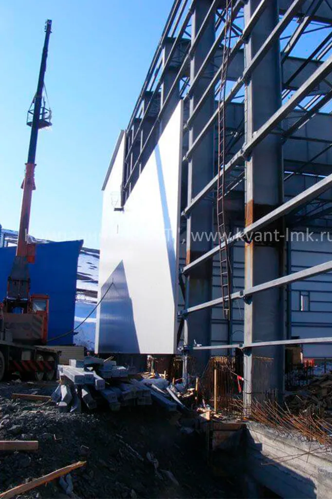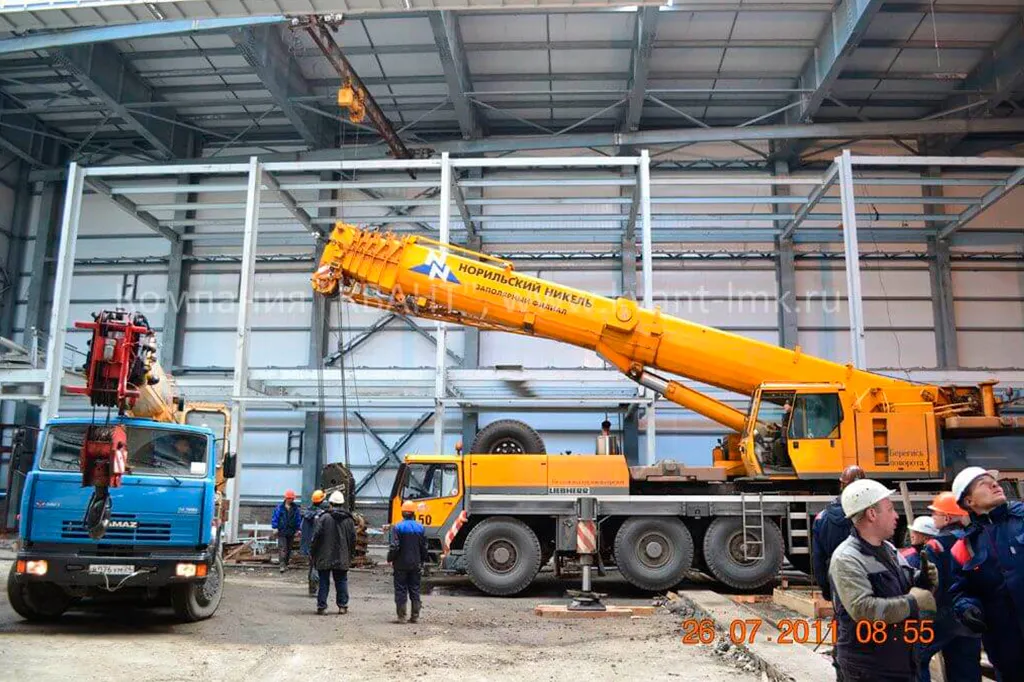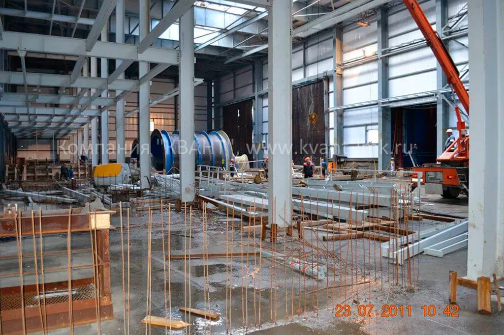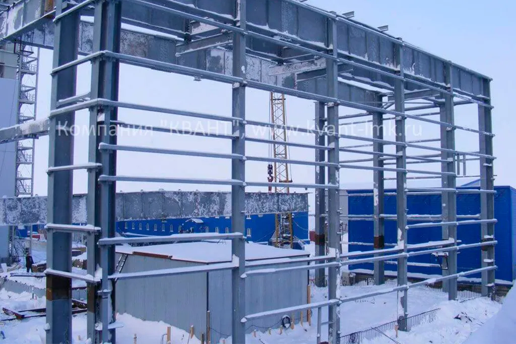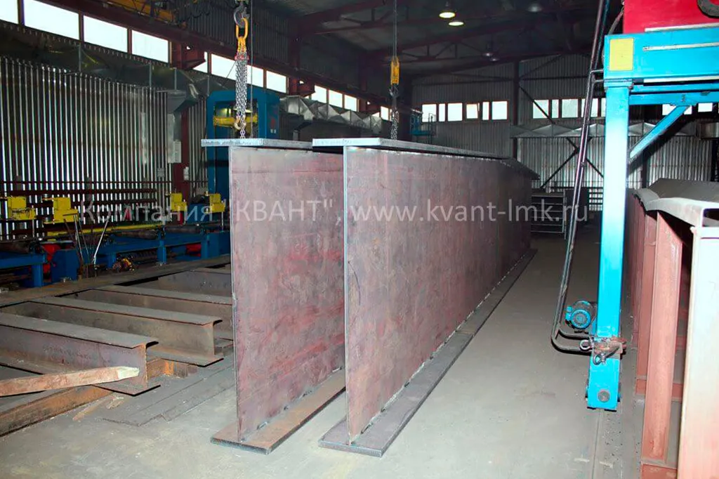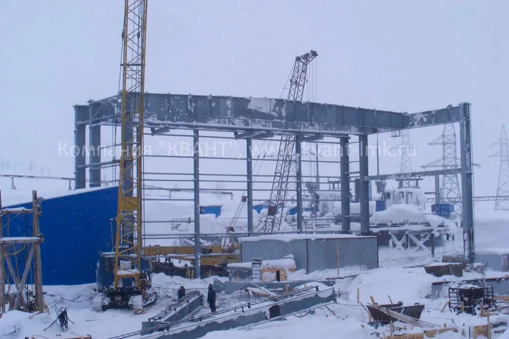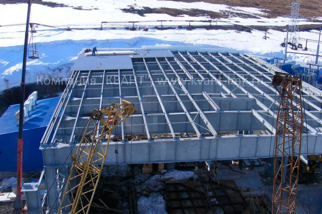 В качестве основных конструкций покрытия Здания подъёмных машин были изготовлены ригели – сварные двутавры переменного сечения. Общая длина ригеля 30 м, высота в коньке 2,0 м. Для приведения отправочных элементов к габаритным размерам специалистами Компании Квант были произведены уникальные расчёты. Ригель был разделён на три части, для соединения которых был разработан узел болтового соединения (фрикционное соединение). Фрезеровка пластин соединения, координатная расточка отверстий, контрольная сборка всех соединений на заводе изготовителе позволила обеспечить быстроту и точность монтажа на строительной площадке. Для удобства монтажа металлоконструкций здания в условиях холодного климата, была произведена доработка чертежей КМ, сварные варианты узловых решений переведены на болтовые. Металлоконструкции были оцинкованы методом электродугового и газопламенного напыления с предварительной абразивоструйной обработкой поверхности м/к до степени Sa 2,5.